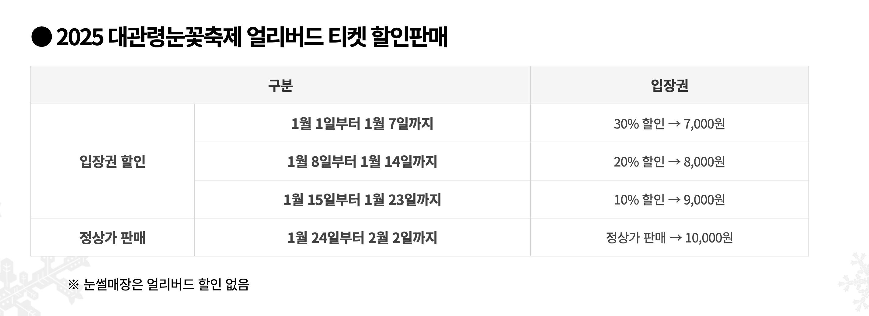 • 혼잡 시간 피하기: 인기 프로그램(눈썰매장, 공연)은 점심시간 전후로 가장 혼잡하므로 이 시간을 피해 다른 활동을 먼저 즐기는 것도 추천.