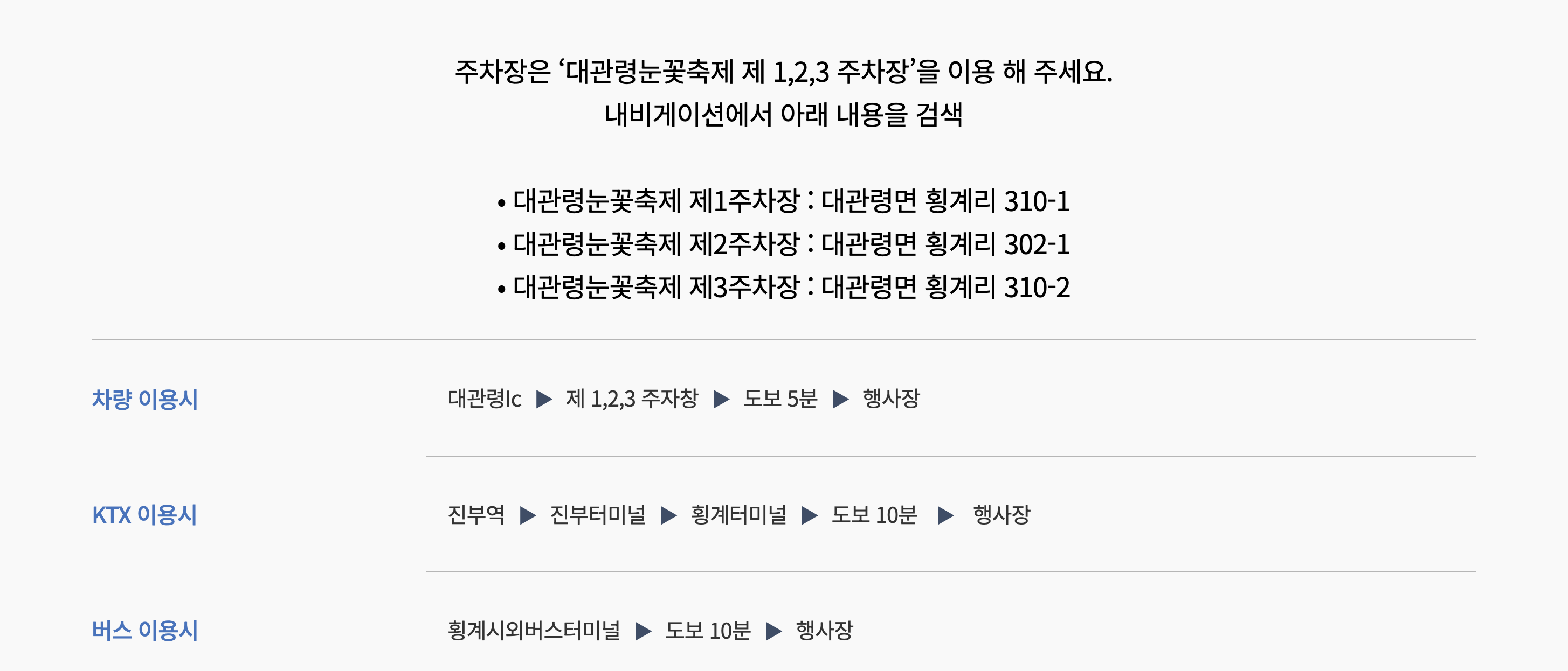내비게이션 정보: "대관령 눈꽃 축제장" 또는 "횡계리 공용주차장"으로 검색 추천.